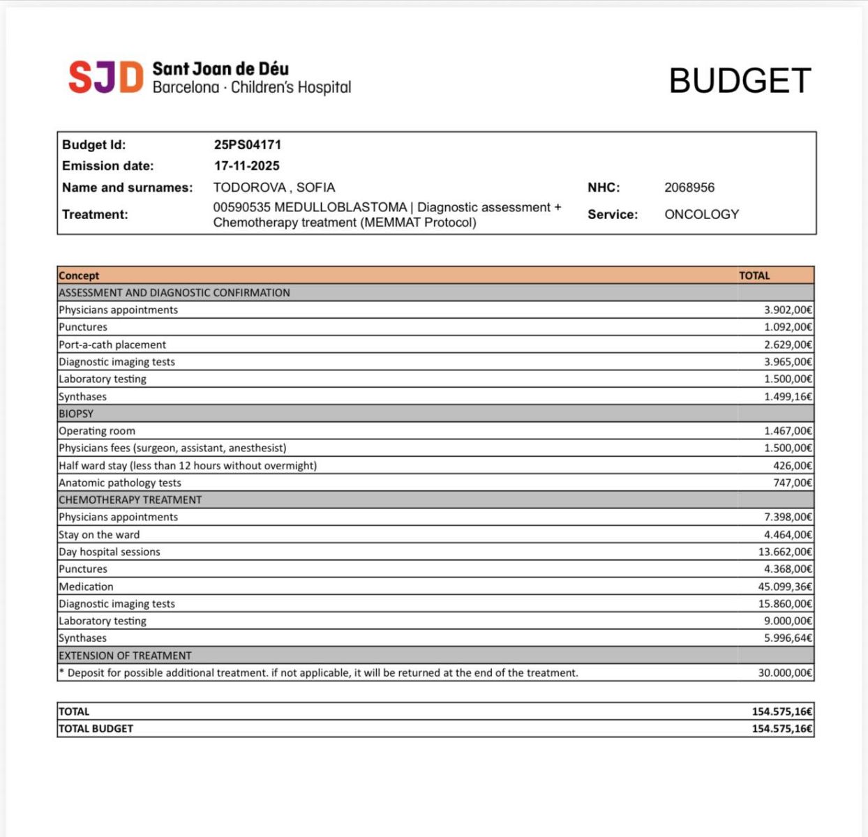 Болницата изиска 100% авансово плащане за първата част от лечението — 154 575.16 евро, без включени физиотерапии и разходи за престой. По сметката на Софи имахме остатък от 143 306.23 евро.